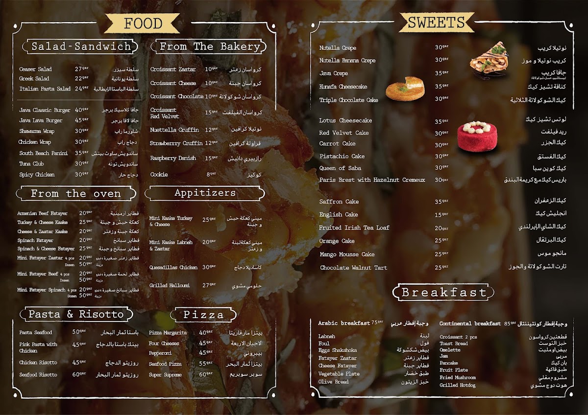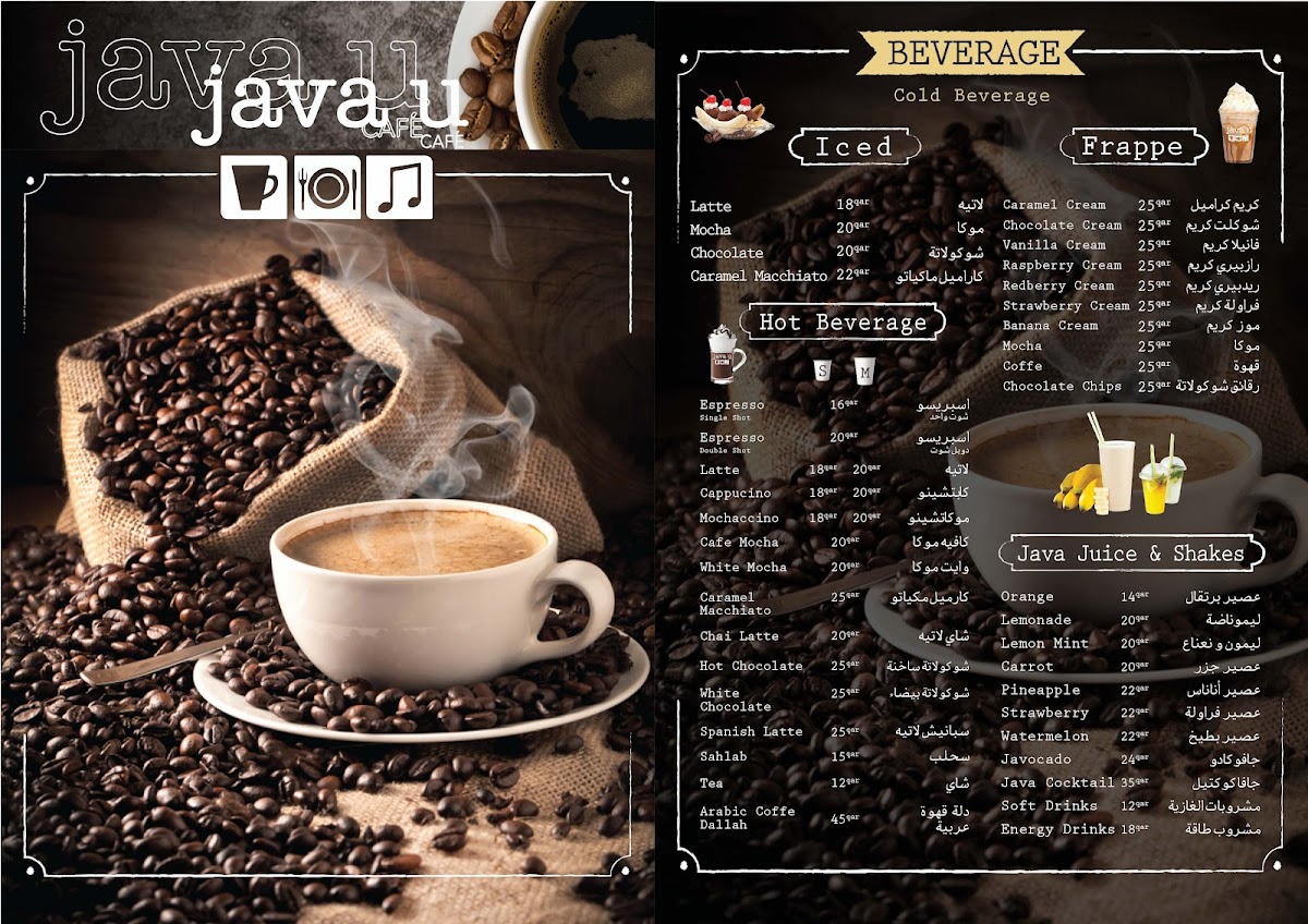 Java U’s menu offers a simple yet satisfying selection of café staples and casual bites that complement its relaxed atmosphere overlooking the water. You’ll find comforting hot drinks like cappuccinos and café mochas alongside a variety of fresh baked goods such as mini fatayers filled with spinach, beef, or zaatar. Light meals like the Java Classic Burger and 4-cheese pizza provide a balanced choice for when you want more than just a snack.